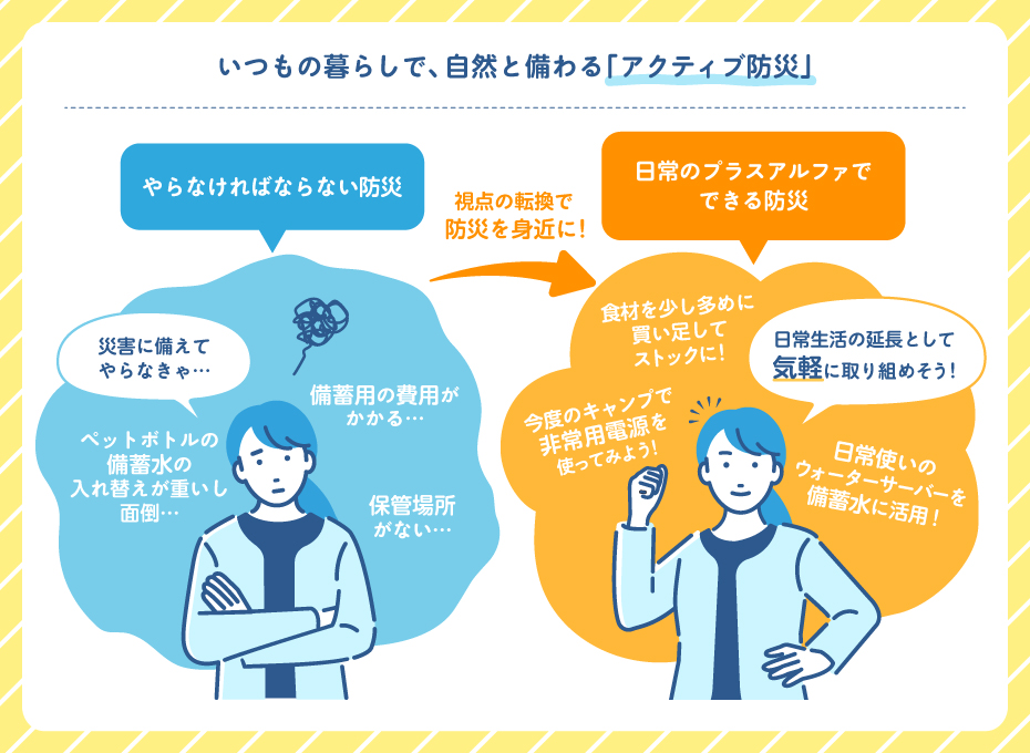 「アクティブ防災」は防災をより身近に、そして前向きに実践するための新しい考え方。防災を特別なものとして切り分けるのではなく、日常生活の延長として取り入れていくことを重視しています。