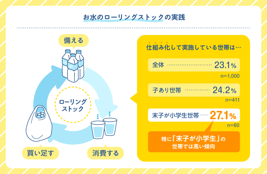 日常の中で使いながら備えるローリングストック。便利な方法ですが、実際に習慣化できている人はどれくらいいるのでしょうか。アンケート調査から、お水のローリングストックの実態を確認してみましょう。
