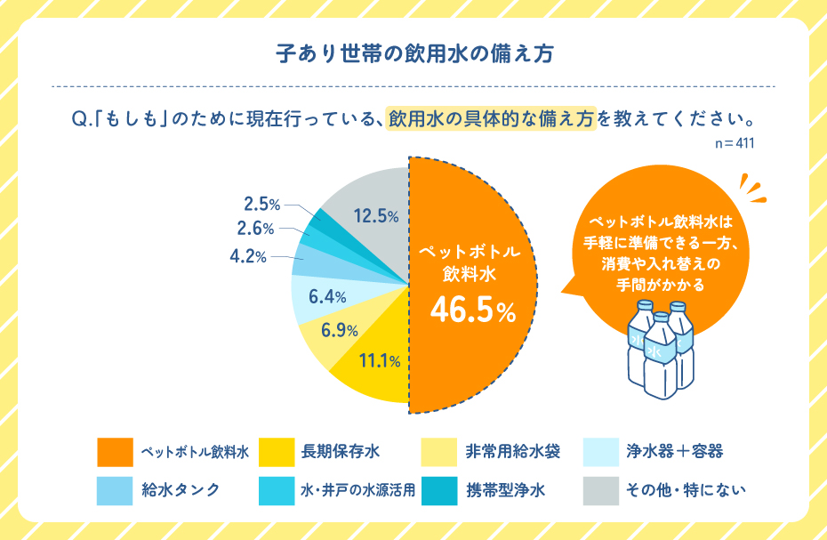 一方で、「もしものために行っている具体的な備え」を尋ねた設問では、最も多かった回答がペットボトルの購入で、子あり世帯では64.2%に達しました。