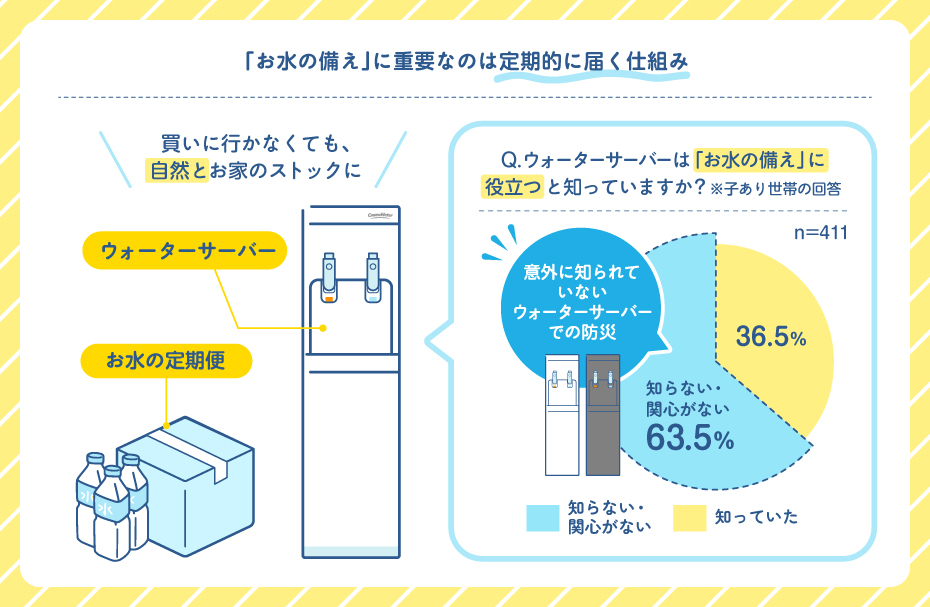 アンケートでは「ウォーターサーバーが非常時に役立つことを知っているか?」という質問に対し、「知らない」「関心がない」と回答した人はなんと68.1%。子あり世帯では「知っている」と答えた人が36.5%で全体の31.9%より高い割合であったものの、約6割以上の家庭が「知らない」「関心がない」と答えており、十分に認知されていないのが現状です。