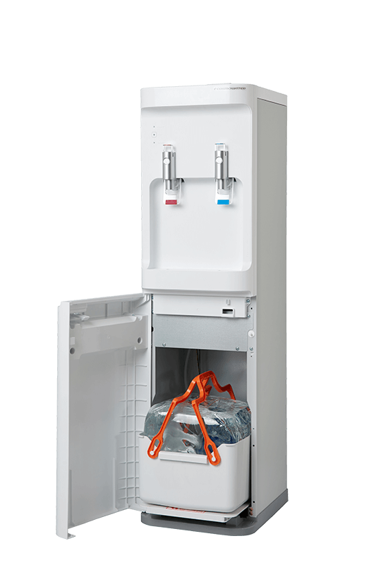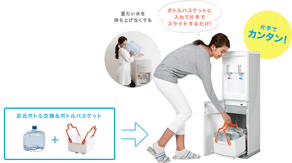 重たい水ボトルを持ち上げずに、足元でかんたんにボトル交換方式。